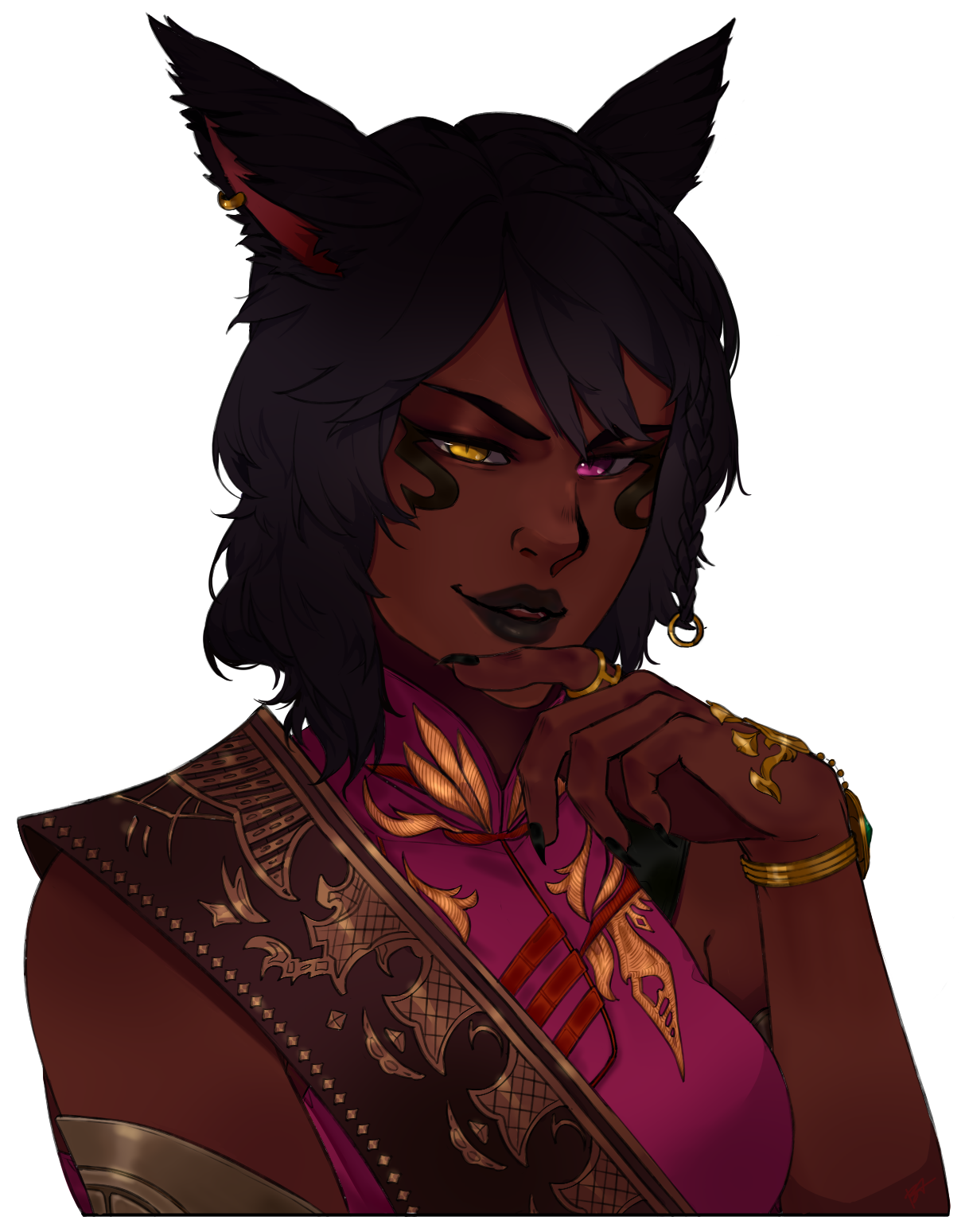 Born into the wealth of opportunity and expectation both offered and demanded from her name, Tahira exudes the pride, prejudice, and passion that can be forged from so unyielding an upbringing. While many within her family follow pursuits of martial and smithing success, she possesses a thirst for more obscure knowledge of aetheric arts and advancements in alchemical ability. From old texts to modern treatises to strange oddities - She greedily grabs for anything to satiate her want for improvement in occupation.No matter her individualisms, she holds herself to oaths of loyalty just as any Basari of note might. First to her Matriarch, then her kin, and finally her city - In that order. Her talents plied for the betterment of the House, where they are folded into the arms and armament services her kin offer in trade for those willing and capable enough to pay for such premium work.Little is beyond her ego - Those who would quiver and whine about temperance and restraint simply lack the imagination and sheer will to see their ambitions realized.